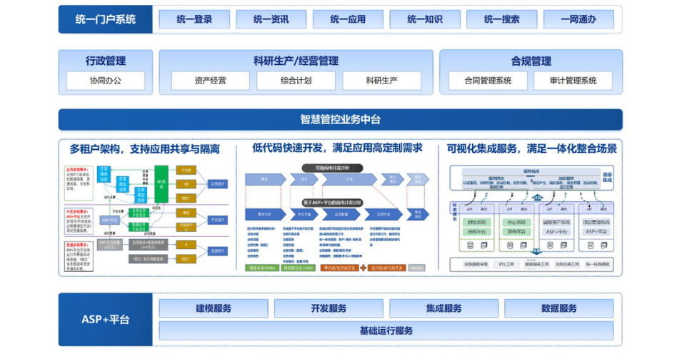 ASP+基礎(chǔ)運行服務(wù):提供了云原生、微服務(wù)、組件化、服務(wù)化等基礎(chǔ)運行環(huán)境和可復(fù)用的基礎(chǔ)技術(shù)組件、可共享的技術(shù)服務(wù),為用戶業(yè)務(wù)系統(tǒng)建設(shè),從平臺層面實現(xiàn)環(huán)境適配能力和全面安全保障能力。