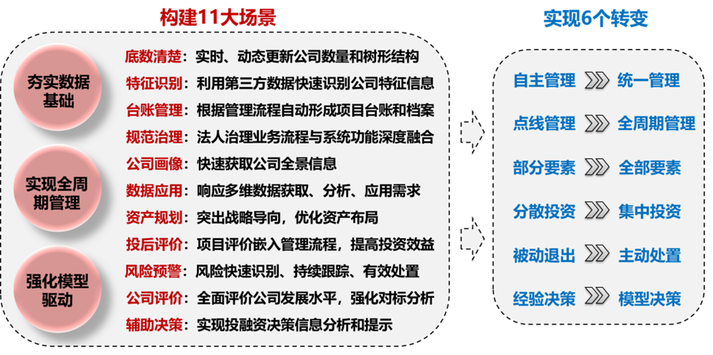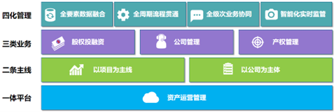 神軟資產運營管理系統以投融資項目、公司兩條主線為抓手,圍繞投融資管理、公司管理、產權管理三類業務進行構建。