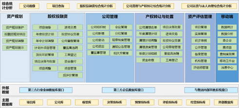 系統包含資產規劃管理、投融資管理、公司管理、產權轉讓與處置管理、資產評估管理、綜合統計分析6大模塊和1個移動端應用,滿足國家信息系統分級保護和等級保護的相關要求。